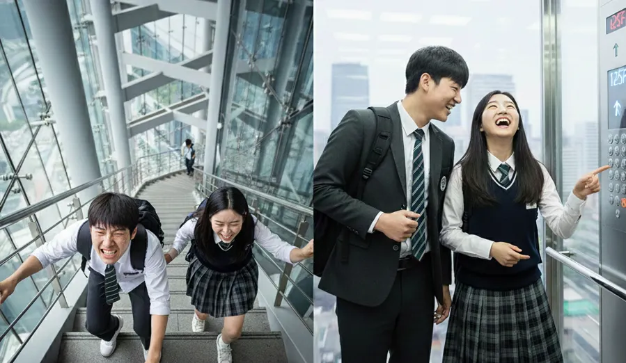 고속 엘리베이트 등 첨단 기술을 적극 활용하는 학생 중, 누가 먼저 고층에 도착?