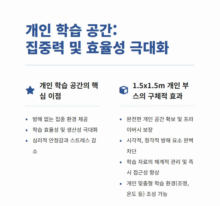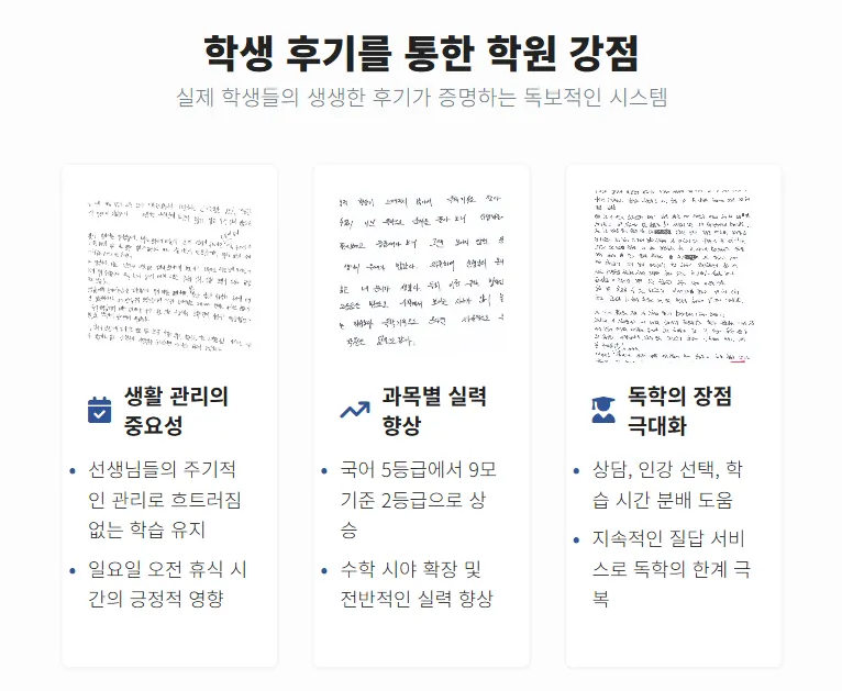 주요 과목 선생님들이 상담을 통해 맞는 인강 선택, 과목별 학습 시간 분배 등의 도움을 잘 받았음. 독학 학원은 자기 혼자 알아서 다 해야 한다고 생각해서 꺼리는 학생도 많지만, 여기에서는 과목별 팁이나, 질답 등의 지속적 서비스가 큰 도움이 됨.