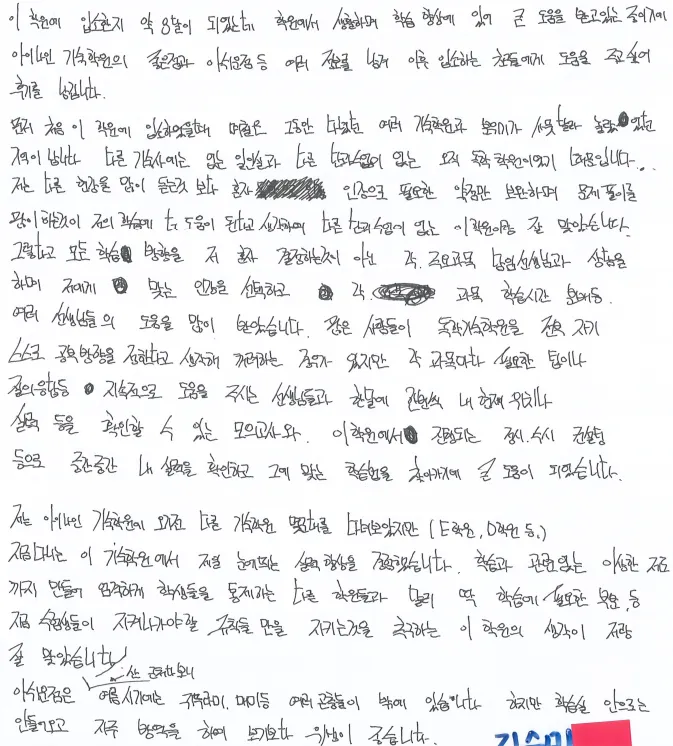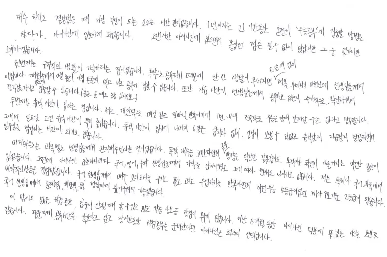 한번 생활이 무너지면 계속 무너지는데, 선생님들이 아침마다 깨워주시고, 주기적으로 확인해 주셔서 경각심을 가지고 공부할 수 있었음. 1년내내 수능을 위해 계속 달려 갈 수는 없다고 생각하는 저는 일요일 오전 휴식 시간이 6일간 자기 합리화 없이 공부하게 해 주어서 특히 좋았음. 과목별 선생님들의 관리가 너무 좋았고 국어는 5등급에서 지금은 9모 기준 2등급이 되었음. 8개월동안 뜻깊은 시간을 보낸 것 같아 최고의 선택이었음.