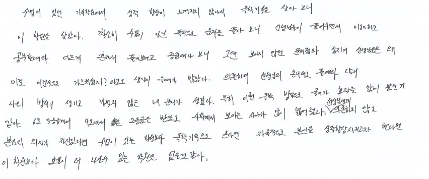 수업이 있던 학원에서 성적이 안 올라 여기 독학을 택했음. 5등급에서 2등급으로 국어 실력 상승했고, 수학도 시야가 많이 넓어짐. 의지가 있는 학생에게는 이 학원보다 나은 학원은 없는 것 같음.