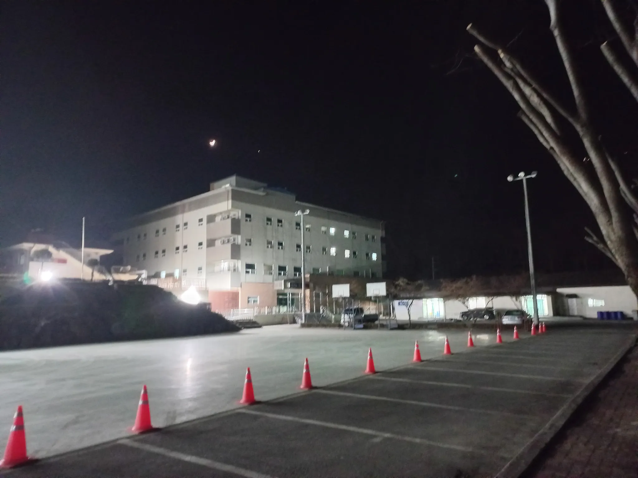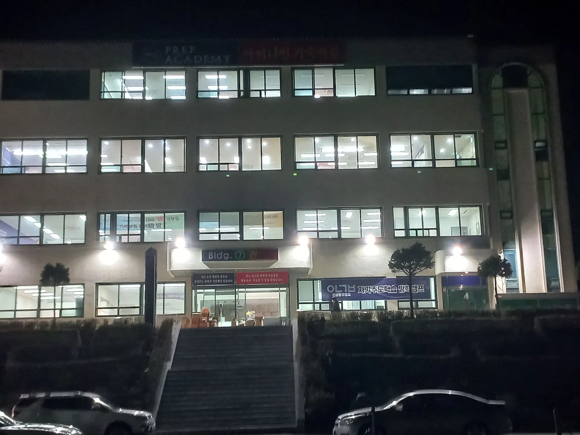 <기숙사 우측 단층으로 된 식당 건물의 불빛과 야간 조명이 비치는 운동장>