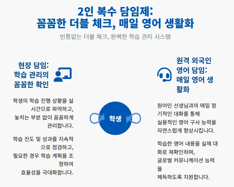 학습관리 | 가맹 본사의 학생별 메니저가 관리 하는 것과 현장 담임이 관리하는 이중 담임 체제임 | 가맹 본사의 학생별 담당 메니저가 학생의 모든 진행 과정을 모니터링하고, 방향을 제시하는 역할을 함 |