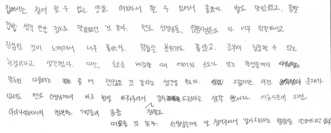 (사진참조) | 시설방문, 방문 상담 | 가능 | 일반적으로 재수생은 1년간 공부하므로 시설 방문한 후 결정하나 재학생 캠프 참여하는 학생의 경우, 방문 없이 홈피를 참고하여 대부분 등록하나, 원하시는 분은 학원에 예약한 후 방문하여 시설 견학 가능함 |