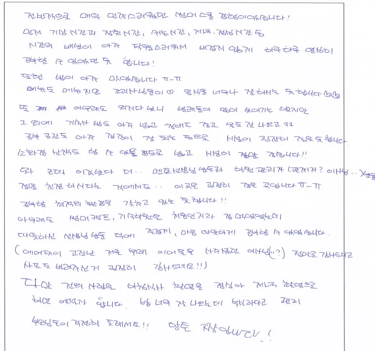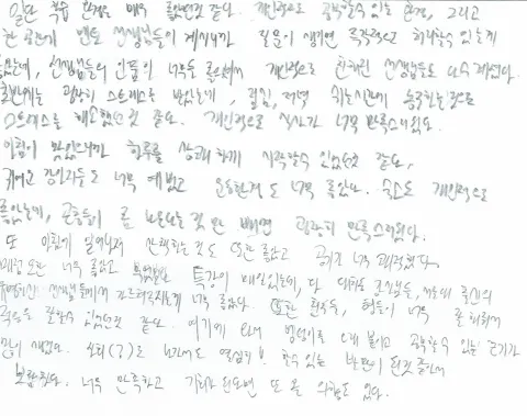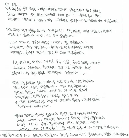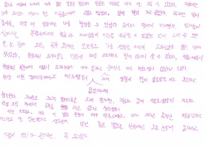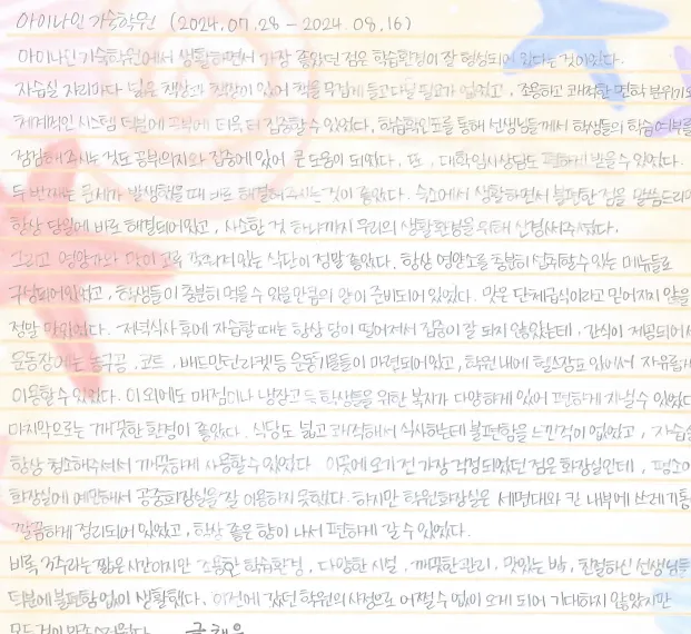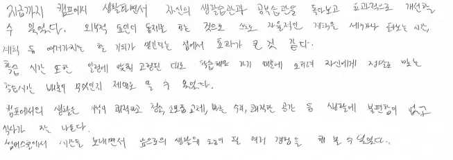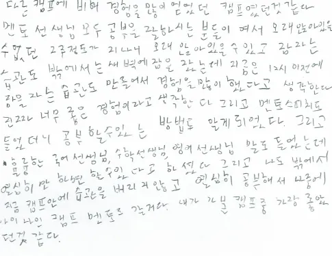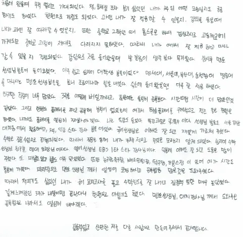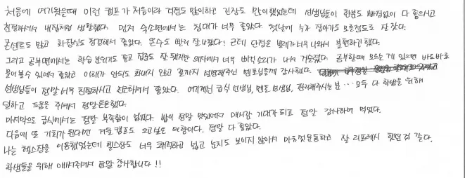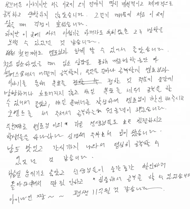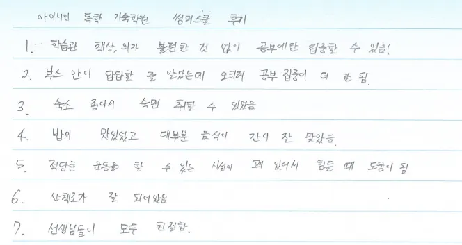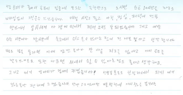 이렇게 오랫동안 공부하는 것이 처음이라 많이 걱정했으나 장시간 집중하는 법도 잘 배우고, 즐겁고 뿌듯한 마음을 가지며 공부했다. 모든 선생님께 감사하며 순수하게 좋은 기억들만 담아서 떠난다. 다음 방학도 여기에서 공부하고 싶다.