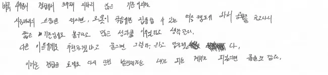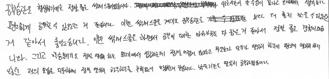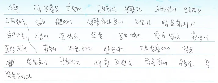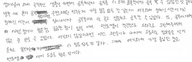 책을 펴기도 싫어하던 나는, 처음에는 버틸 수 있을까 걱정했으나, 길게 느껴졌던 3주가 내일이면 끝난다니 아쉽다. 이제는 진도도 잘 나가고 집중력도 매우 높아졌다. 집중력 없고 산만한 저를 다른 사람으로 만들어주셔서 감사합니다.